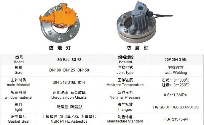 帶燈視鏡,帶防腐燈視鏡,帶防爆燈視鏡廣泛應(yīng)用于管道、設(shè)備裝置中重要附件。該視鏡主要由視鏡底板、視鏡玻璃、緊固件、密封件組件等組成。帶燈視鏡安裝于壓力容器、真空容器、罐體、反應(yīng)器、過濾器、沸騰床等罐體和密閉容器上,在承受與容器相同壓力、溫度條件下觀察容器內(nèi)部情況;也可用于溫度高,腐蝕性強(qiáng)、易中毒、危險(xiǎn)性較大,易結(jié)晶的化工塔器中,以保證其安全生產(chǎn)。當(dāng)觀察環(huán)境昏暗時(shí),需要配置視鏡射燈,其中分為防爆型和防腐型兩種形式。