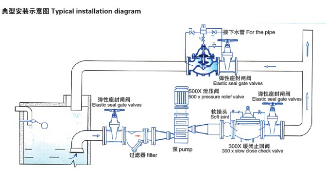由主閥、泄壓/持壓導(dǎo)閥針閥、球閥、微形過濾器和壓力表組成水力控制接管系統(tǒng)。利用水力自動(dòng)操作,即可以作泄壓閥用又可作持壓閥用。作泄壓閥用時(shí),可維持供水路壓力在設(shè)定的安全值之下;做持壓閥用,可維持主閥上游水壓在設(shè)定值之上,保持主閥上游供水壓力。
