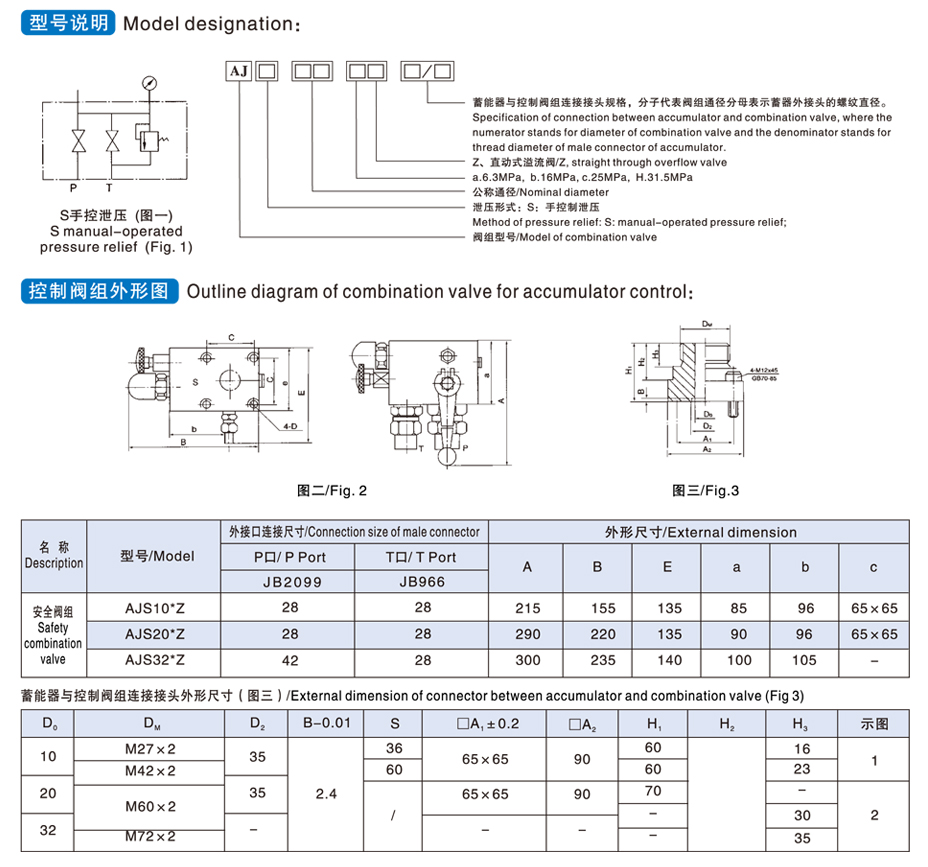 AJ型蓄能器控制閥組由球閥、安全閥和卸荷閥等組成,其中:安全閥有螺紋插裝式溢流閥,卸荷閥有手動控制(手動控制為螺紋針型閥)。