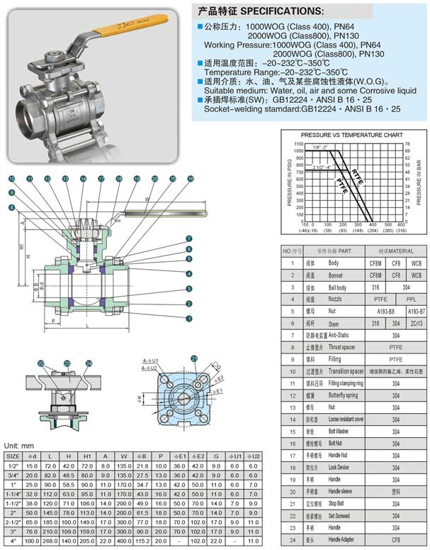 承插焊球閥,三片式承插焊球閥參數(shù)尺寸圖: