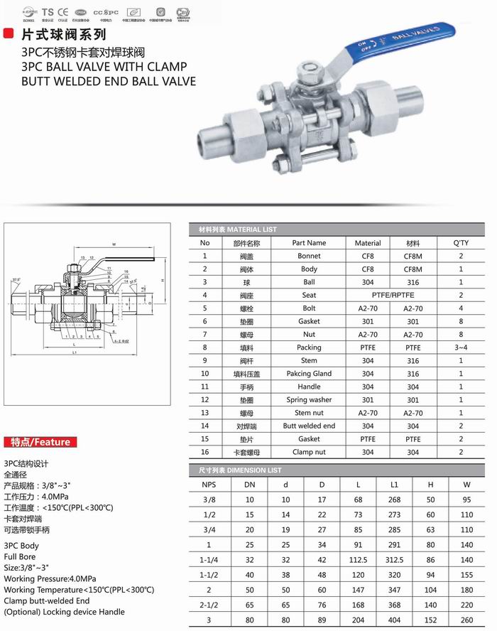 1.產(chǎn)品名稱:三片式帶卡套對(duì)焊球閥