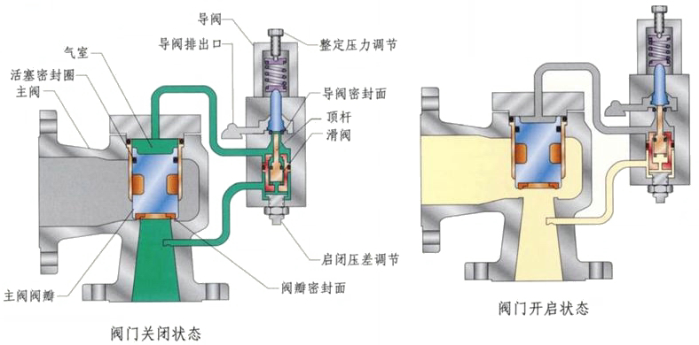 先導(dǎo)式安全閥是利用導(dǎo)閥來感測(cè)被控壓力信號(hào)并給出信號(hào),當(dāng)安全閥前的壓力低于整定壓力時(shí),導(dǎo)閥和主閥都處于無泄漏的關(guān)閉狀態(tài)。主閥通過導(dǎo)閥的供應(yīng)導(dǎo)管,作用于導(dǎo)閥閥座和主閥閥芯頂部,由于閥芯的頂部大于底部(閥座區(qū))作用力使閥芯保持向下,閥前壓力越接近整定壓力關(guān)閉越嚴(yán)密,這種自密封結(jié)構(gòu)在主閥硬軟雙質(zhì)密封副作用下,凈密封力隨著管道壓力增加和接近設(shè)定點(diǎn)而增加。當(dāng)閥前壓力達(dá)到或超過整東壓力時(shí),導(dǎo)閥開啟,主閥迅速打開,介質(zhì)排放;當(dāng)閥前壓力回到整定壓力以下時(shí),導(dǎo)閥關(guān)閉,主閥也隨之關(guān)閉。